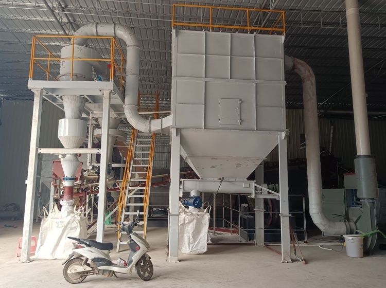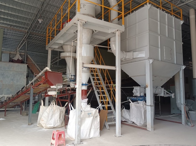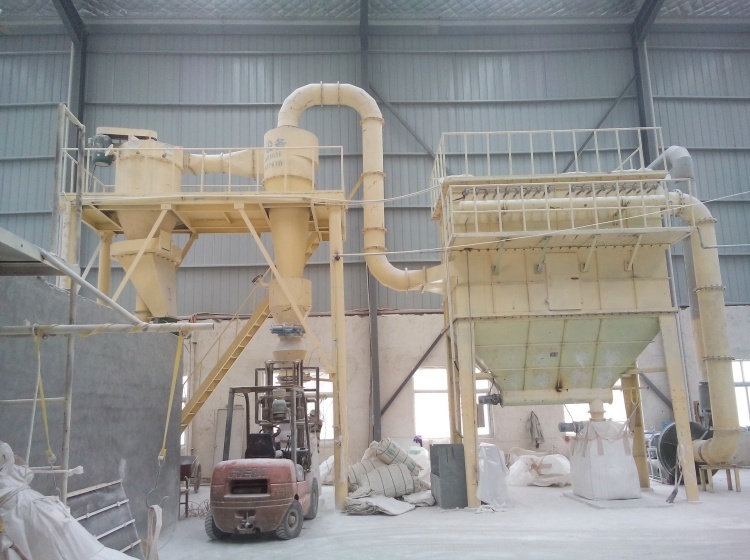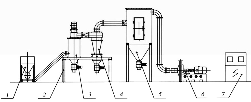 整套分级装置由气流分级机、旋风收集器、脉冲除尘器、高压引风机、电控柜等组成。气流分级机是带有二次进风及立式安装的大叶轮子的强制型分级机。工作时物料在引风机引力的作用下由下筒身进入,并上升至分区,由于分级叶轮转子的高速旋转,粒子既受到分级叶轮旋转产生的离心力,又受到引风机产生的向心力,当粒子受到的离心力大于向心力,分级径以上的粗粒子被甩到筒体内壁失速沿壁面下滑,外界二次风通过均匀分布在锥体上的进风口进入,对粗粒子进行产生风筛作用,将混杂或粘附于粗料中的细粉分离干净。分离后的粗料由卸料装置收集排出分级机,分级径以下的细粉随气流进入旋风收集器、脉冲除尘器收集下来,净化后的气体由引风机排出。