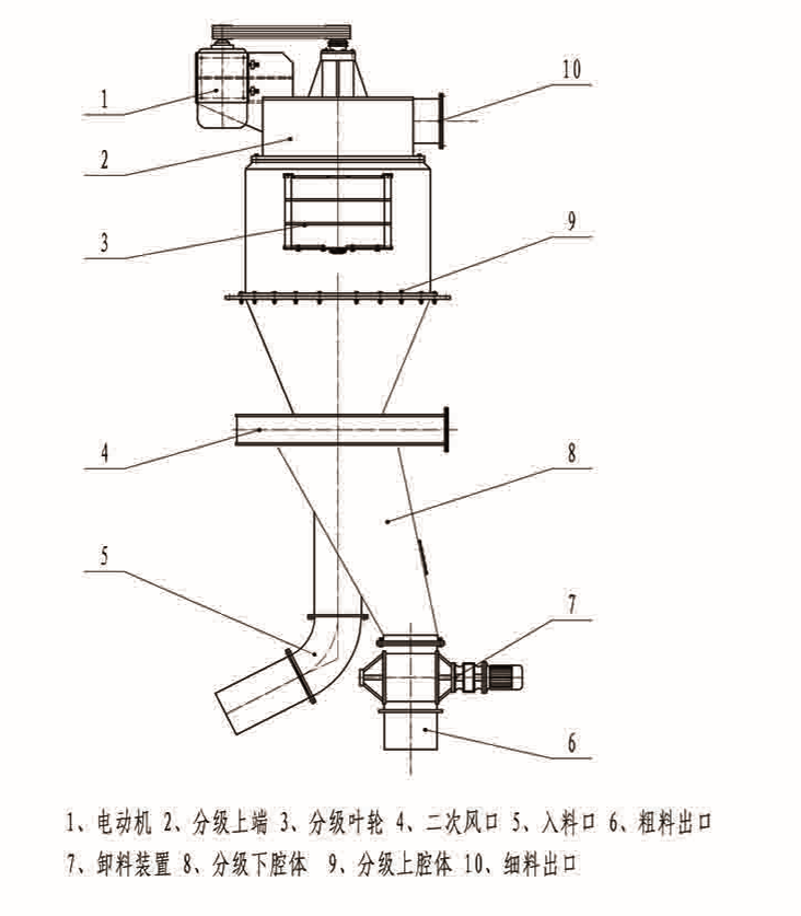 3、采用低转速立式单叶轮分级结构,物料流场稳定,设备处理量大,分级效率高。